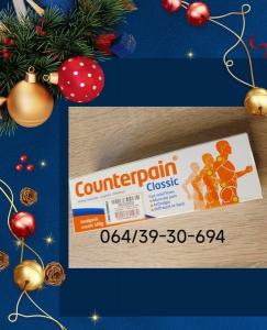 Deluje posle prvog mazanja , Counterpain Classic PharmaSwiss, ima široku primenu kod profesionalnih sportista rešava mnogo brze problem sportskih povreda . Counterpain Classic 100gr je krema koja ublažava bolove u mišićima zglobovima i reumatske tegobe kao i povrede nastale pri sportskim aktivnostima . Grčka krema perfektna za kičmene i reumatske probleme. Counterpain Classic kremu koriste profesionalni sportisti . . . a pre svega fudbaleri. Deluje odlično za bolove u mišićima, bolove u zglobovima, bolove u leđima, umirujući artritički bol. Counterpain – bezbolni krem proizvodi napravljeni od strane lokalnih analgetika iz grupe zajedničkog, mišića i skeletnih poremećaja. Mišićni bol, lumbago, išijasija, reumatizam, bol u leđima i struku, artritis. Aktivni sastojci su metil salicilat 10,2%, eugenol 1,36% i mentol 5,44% . . . Deluje umirujuće i efekat koji izaziva bolju cirkulaciju krvi, čime nestaje bol u leđima, struku, mišićima i zglobovima. Utrljava se dva do tri puta dnevno na bolno mesto , koža veoma brzo upije i ne ostaju tragovi na odeći. Original iz PharmaSwiss, nije kineska kopija kreme.