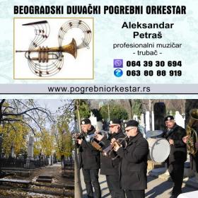 Vodeći se ovom mišlju, mi smo oformili naš duvački pogrebni orkestar koji možete pozvati da Vam pomogne u ispraćaju Vaše drage osobe. Naš orkestar, sastavljen je od profesionalnih školovanih muzičara koji dugi niz godina krajnje profesionalno obavljaju ovu delatnost na sahranama, opelima, kremacija, polaganjima urne, pomenima, ispraćajima… Nastupamo kao orkestar, ali i pojedinačno – truba, violina, crkveni hor – sve u zavisnosti od želje klijenata. U repertoaru koji sviramo nalaze se pogrebni marševi, starogradske pesme, romanse, romske pesme, sevdalinke, klasična muzika… Trudimo se svima da izađemo u susret onoliko koliko je u našoj moći,naravno da to bude sa ukusom uzimajući u obzir o kakvom događaju je reč.